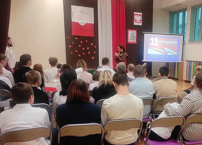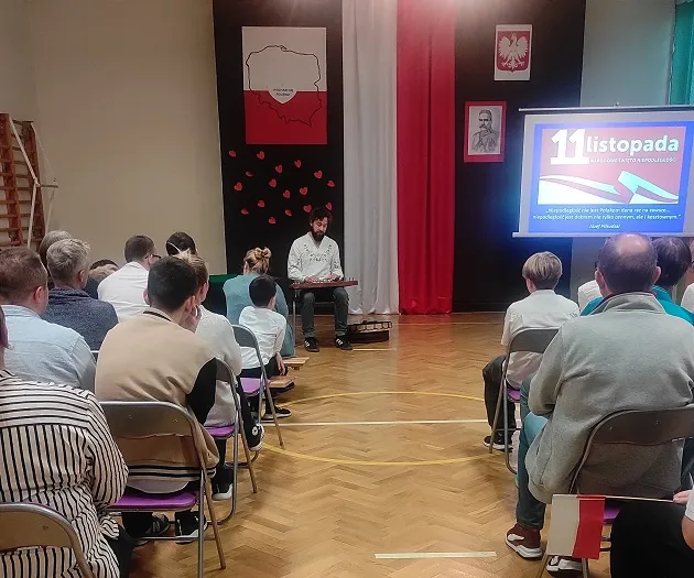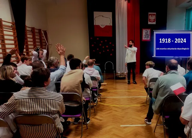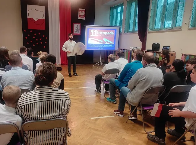 Nasz gość opowiadacz, pan Szymon Góralczyk – Armatowski zabrał uczniów i dorosłych w świat magicznych opowieści, nawiązujących do legendarnej przeszłości Polski. Opowiedział także wojenne historie, które w krótkiej formie niosły wielkie przesłanie: „Święto niepodległości jest radosne, przypomina o 11 listopada 1918 roku – o dniu odzyskania wolnej ojczyzny. Współczesny patriotyzm to między innymi: lubić się, być dla siebie nawzajem miłym i zgodnie żyć w pięknej krainie, Polsce”. Piękne słowa…