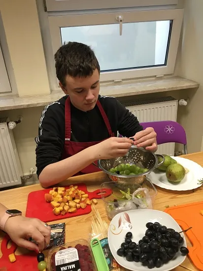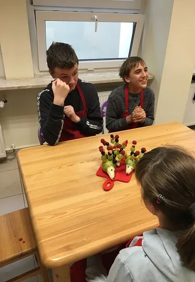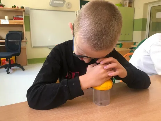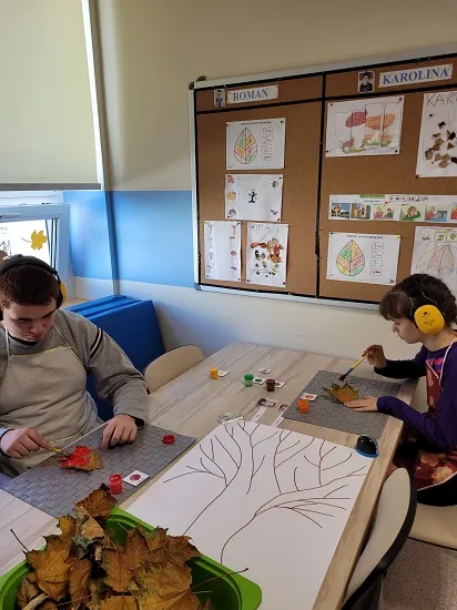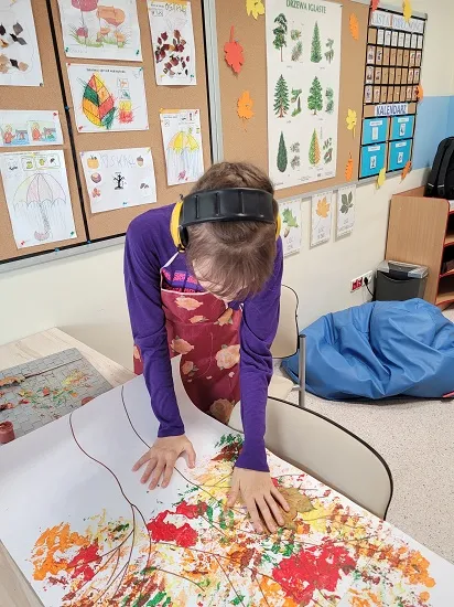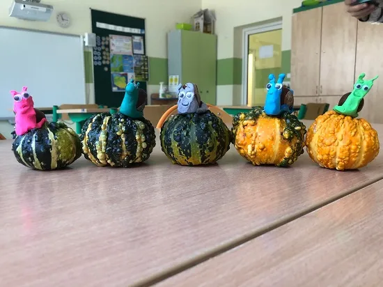 Uczniowie klasy IIb postanowili zadbać o nasze boisko szkolne – oczyścili je z liści, a wśród nich znaleźli ciekawy okaz, który został poddany wnikliwej obserwacji na lekcji proekologicznej. Oczywiście nic mu się nie stało – nasz mały przyjaciel wrócił do swojego naturalnego środowiska. Warto wspomnieć, iż uczniowie klasy IIb wzięli udział w akcji i konkursie „Warszawskie Święto Drzewa” organizowanym przez Klub Gaja wykonując instalację pt. „Jesienna Hybryda” – gratulujemy oryginalnego pomysłu i nazwy i trzymamy kciuki za kolejne pomysły. Klasa Vb w tym roku rozwija swoje kulinarne zdolności i kreatywnie działa w kuchni dydaktycznej. Natomiast uczniowie klasy VII uczestniczyli w wielu ciekawych aktywnościach, dzięki którym, rozwijali spostrzegawczość, logiczne myślenie, komunikację, motorykę małą i dużą. W trakcie zajęć pracowali z tablicą interaktywną, wykonali różnymi technikami piękne prace plastyczne, a także brali udział w zajęciach stolikowych, zabawach sprawnościowych i muzyczno - ruchowych.