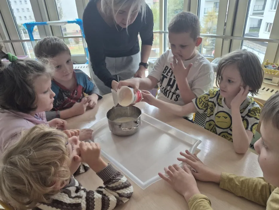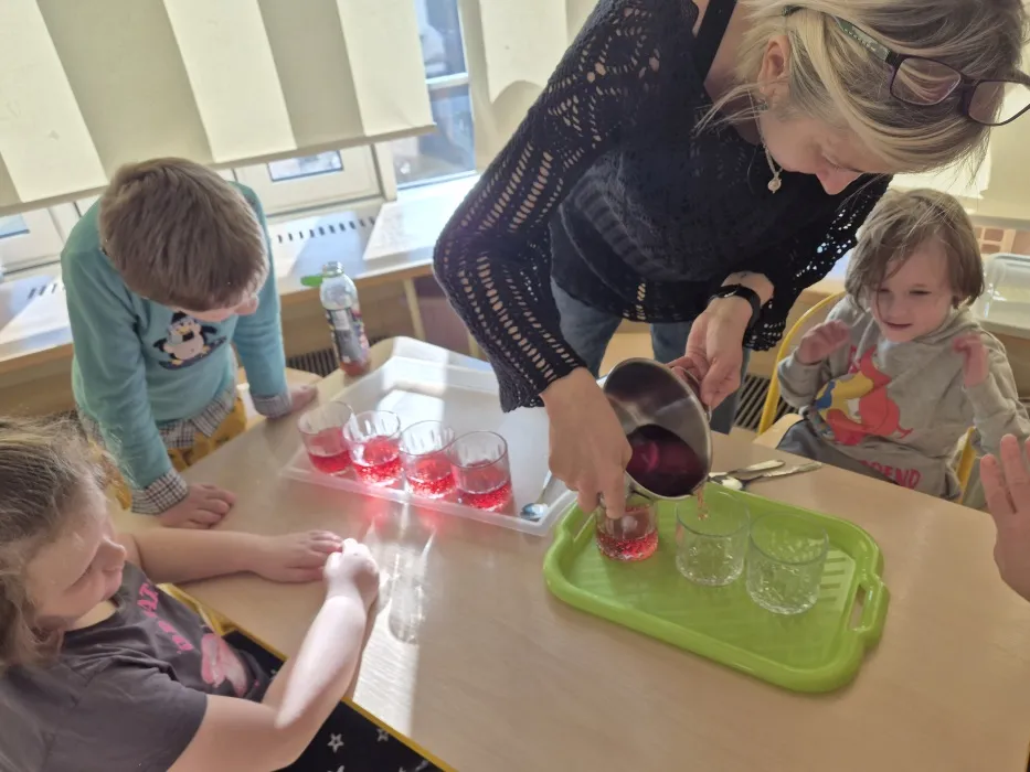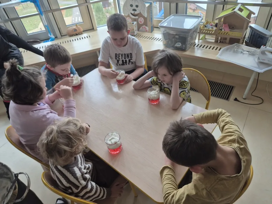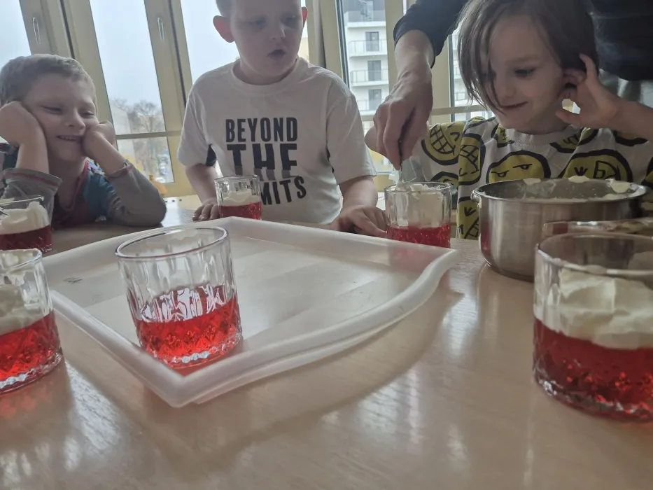 Polska to nie tylko piękna przyroda i wielka historia, ale również przepyszne przysmaki, które okazały się kreatywnym sposobem na utrwalenie narodowych symboli w pamięci naszych przedszkolaków, które wręcz chłoną wiedzę poprzez zabawę i zaskakujące aktywności. Dzieci z obu grup, pod okiem i z pomocą nauczycieli, przygotowały pyszną galaretkę o smaku polskich truskawek, na którą ubiły dodatkowo białą śmietanę. Można było więc tylko palce lizać po tak pysznym, biało-czerwonym deserku. Nie tylko to jednak, skupiało uwagę wszystkich dzieci. Wspólnie obejrzeliśmy również bardzo interesujące prezentacje o Polsce i jej symbolach, wspólnie pośpiewaliśmy, a także posłuchaliśmy ciekawych historii o naszym pięknym kraju. Było więc nie tylko pysznie, ale i ciekawie. Serdecznie pozdrawiamy!