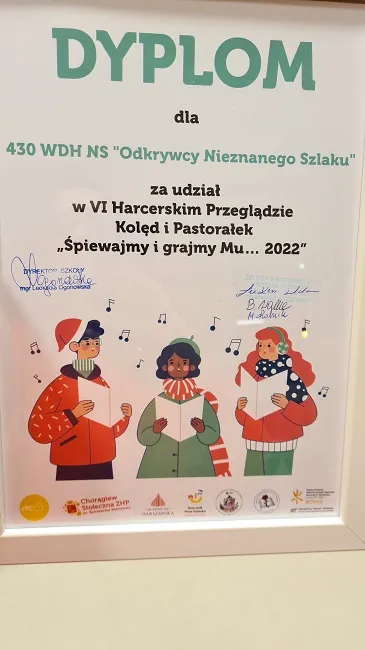 14 grudnia 2022 r. 430WDH Odkrywcy Nieznanego Szlaku kolejny raz miała możliwość zaprezentowania się podczas Harcerskiego Przeglądu Kolęd i Pastorałek, który odbył się już po raz szósty. Uczniowie wykonali piosenkę: „Zima, zima, zima” – w wesołej i skocznej aranżacji oraz kolędę „Przybieżeli do Betlejem”, dodatkowo wzbogacając swój występ akompaniamentem na instrumentach perkusyjnych.