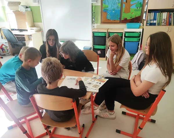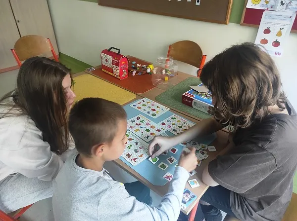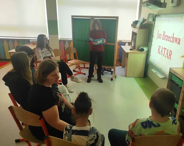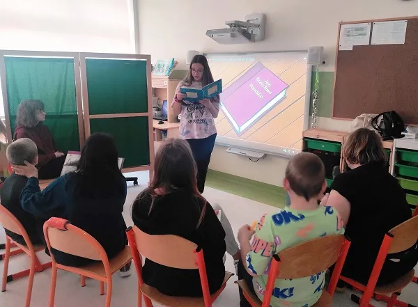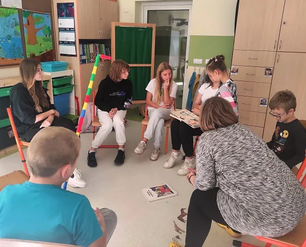 Czytamy, słuchamy, bawimy się. Zajęcia w ramach międzyszkolnej współpracy przynoszą dzieciom radość i zaciekawienie. Poznawanie nowych książek oraz oglądanie ilustracji ze starszymi koleżankami to nowe, ale rozwijające doświadczenie.