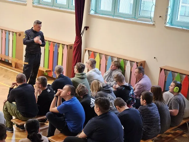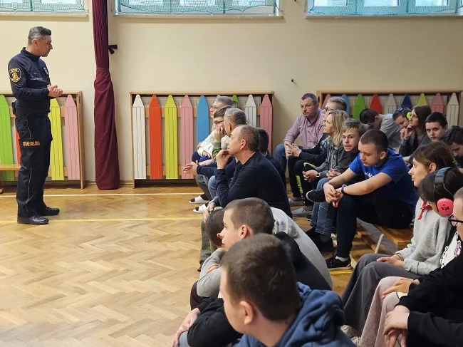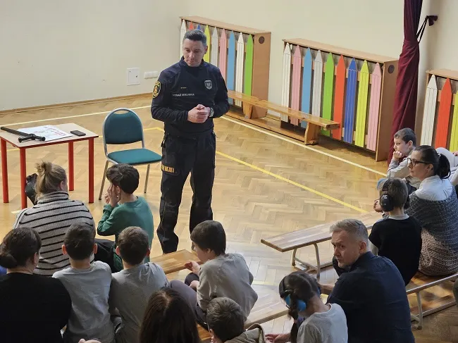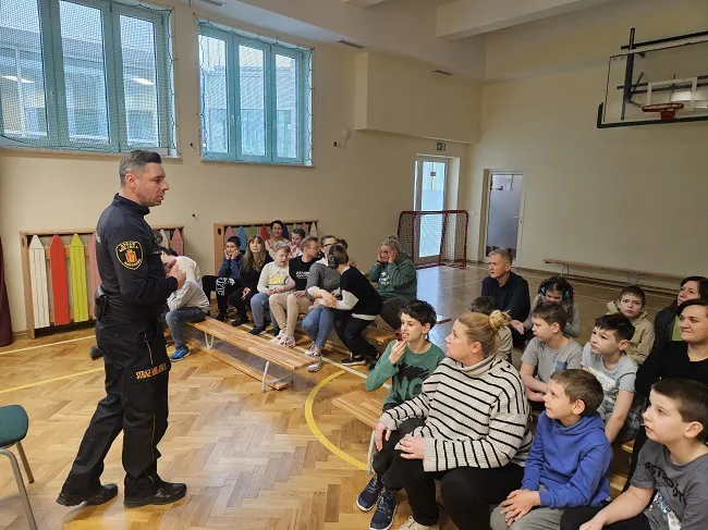 W naszej szkole duży nacisk kładziemy na bezpieczeństwo dlatego uczniowie klas I-VIII wraz z wychowawcami w dniu 19.02.2025 r. wzięli udział w spotkaniu z przedstawicielami Straży Miejskiej. Celem spotkania było przypomnienie zasad bezpieczeństwa w szkole i poza nią. Funkcjonariusz Straży Miejskiej rozmawiał o zasadach jakie należy stosować w kontaktach z obcymi.