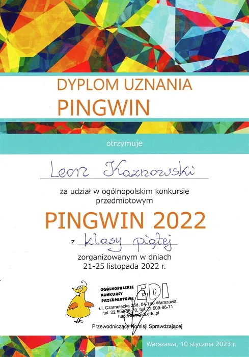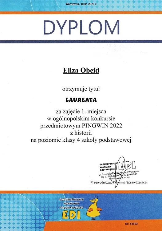 W ostatnim dniu szkolnym przed feriami, w piątek, 10 lutego 2023 r. Pani Dyrektor Ewa Warszewska wręczyła przysłane przez Organizatorów piękne dyplomy i nagrody książkowe dla laureatów Ogólnopolskiego Konkursu Historycznego EDI – „Pingwin 2022”.