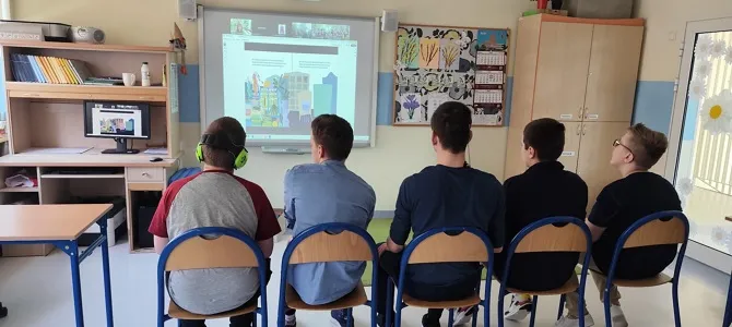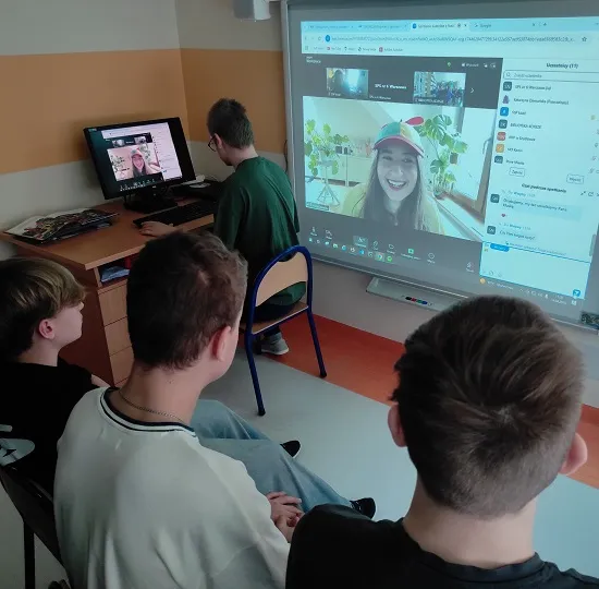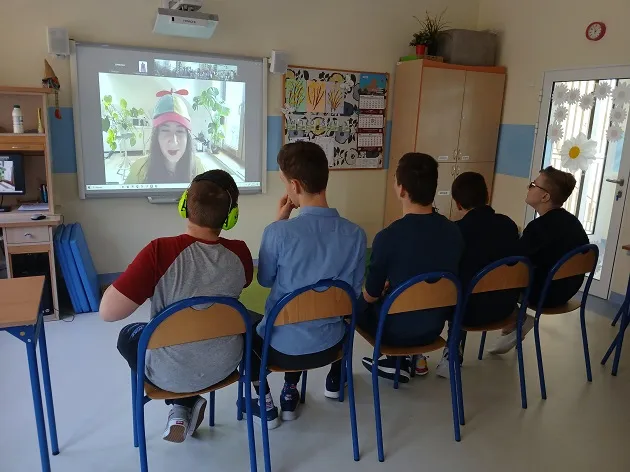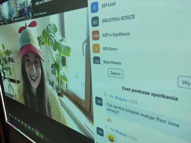 Podczas zajęć nieoczekiwanie okazało się, że my słyszymy wszystko, ale nas nie słychać! Z sukcesem pokonaliśmy ten problem w sposób, jaki umożliwiają współczesne technologie. Po raz kolejny przekonaliśmy, że Bartek Ł. potrafi z nich znakomicie korzystać😀. Uczniowie z innych szkół w Polsce ustnie zadawali pytania pani ilustratorce, a Bartek pisał na czacie. I to tak, że wszyscy podziwiali Jego szybkość!