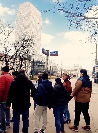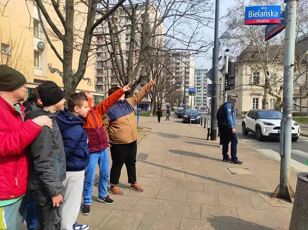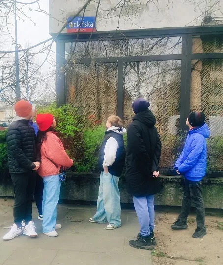 Uczniowie obejrzeli miejsca uwiecznione na starych fotografiach i spojrzeli przez nie na teraźniejszość, mknącą nieistniejącą w międzywojennej Warszawie Aleją Solidarności, na nowo powstający budynek w miejscu Pasażu Simonsa, na historyczne ulice: Nalewki, Bielańską i Długą.