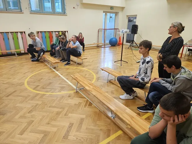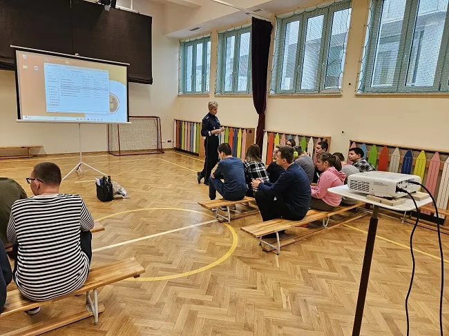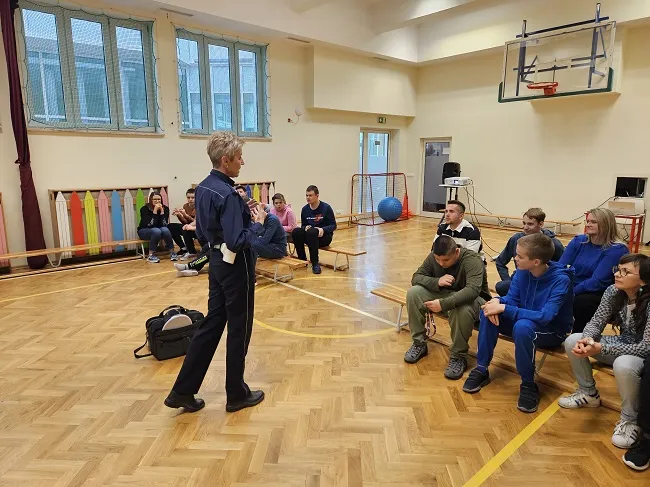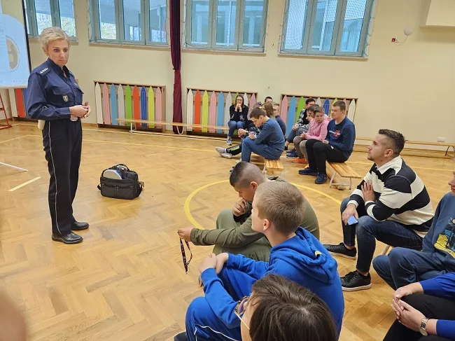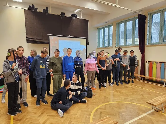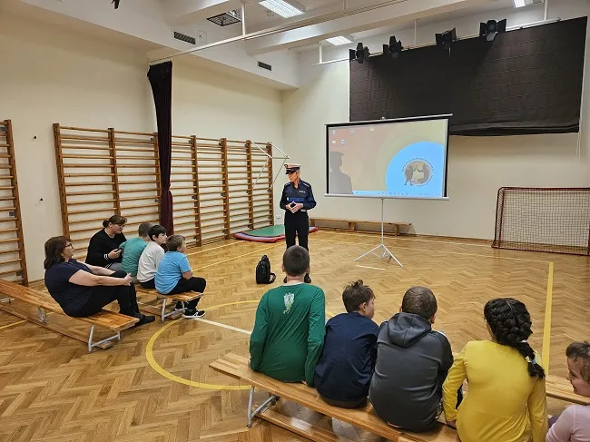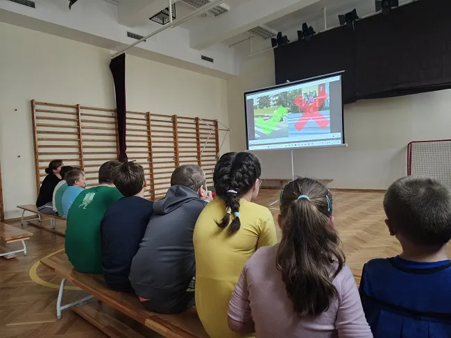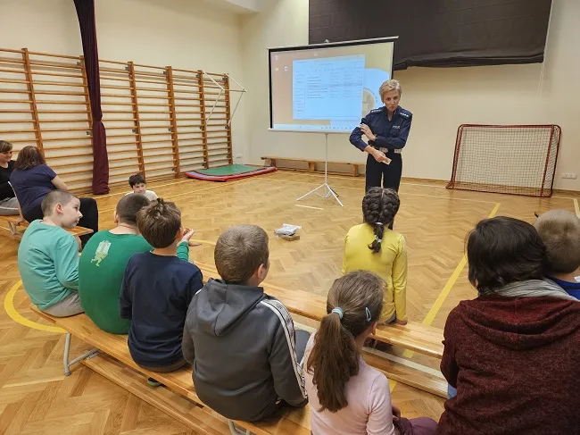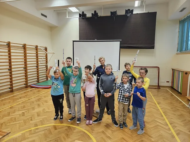 W dniu 30.10.2024r. odbyło się spotkanie klas I-VIII z policjantem z Wydziału Ruchu Drogowego Komendy Stołecznej Policji. Po rozmowie z uczniami na temat zasad ruchu drogowego i bezpieczeństwa na drodze dzieci w sposób praktyczny przypomniały sobie zasady. Poprzez zabawę miały możliwość bycia pieszym. Utrwaliły zasady przechodzenia przez jezdnię, umiejętność rozpoznawania ważnych znaków drogowych, sygnalizatorów świetlnych oraz pojęć związanych z ruchem drogowym.