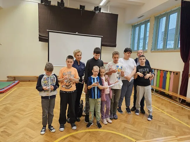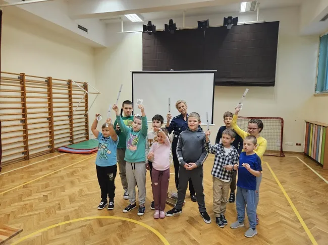 Poszerzyły wiedzę na temat zachowania się pieszych na drodze. Uczniowie aktywnie uczestniczyły w tych praktycznych i bardzo ciekawych zajęciach. Z dużym zainteresowaniem słuchały, oglądały prezentowane filmy oraz współpracowały z prowadzącym. Policjant uczulił także uczniów, aby zawsze pamiętali o zapinaniu pasów podczas podróży samochodem. Ponadto podkreślił, jak ważną rolę pełnią elementy odblaskowe, które każdy uczeń powinien nosić. Dodatkowo omówione zostały zasady postępowania w kontaktach z nieznajomym oraz najważniejsze numery alarmowe. Spotkanie było interesujące i pouczające, a przekazana wiedza teoretyczna i praktyczna poprawi bezpieczeństwo naszych uczniów. Na zakończenie dzieci otrzymały od policjanta opaski i breloczki odblaskowe.