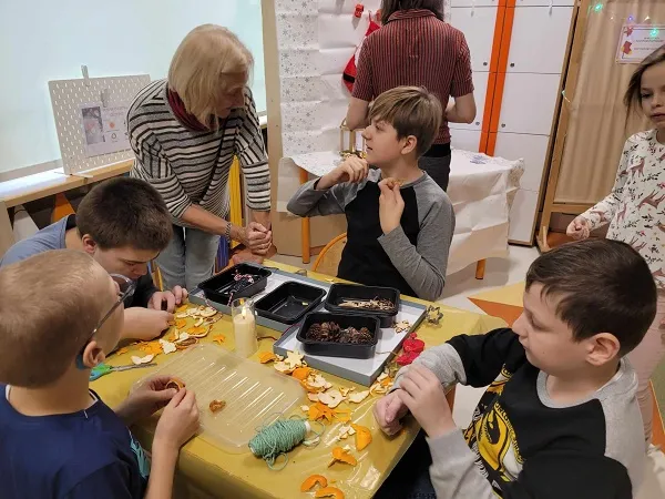Korzystaliśmy z pachnących przypraw kojarzących się ze Świętami (cynamon, goździki, anyż), roślin, szyszek i innych darów natury. Z wszystkich materiałów powstały wspaniałe, pachnące i ekologiczne ozdoby, które można podziwiać na choince w holu szkoły.