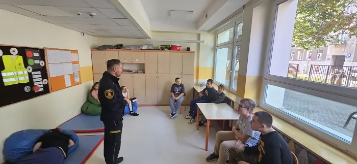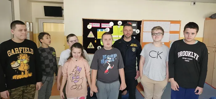 W dniu 08.10.2025 r. odbyło się w świetlicy szkolnej spotkanie z funkcjonariuszem Straży Miejskiej. Po rozmowie na temat ruchu drogowego i bezpieczeństwa na drodze, dzieci w sposób praktyczny przypomniały sobie zasady przechodzenia przez jezdnię i umiejętność rozpoznawania ważnych znaków drogowych, sygnalizatorów świetlnych oraz pojęć związanych z ruchem drogowym. Poszerzyły wiedzę na temat zachowania się pieszych na drodze. Uczniowie aktywnie uczestniczyli w praktycznych i zajęciach. Z dużym zainteresowaniem słuchały, oraz współpracowały z prowadzącym. Strażnik uczulił także uczniów, aby zawsze pamiętali o zapinaniu pasów podczas podróży samochodem. Ponadto podkreślił, jak ważną rolę pełnią elementy odblaskowe, które każdy uczeń powinien nosić. Spotkanie było interesujące i pouczające, a przekazana wiedza teoretyczna i praktyczna poprawi bezpieczeństwo naszych uczniów. Na zakończenie dzieci otrzymały od strażnika opaski i breloczki odblaskowe.