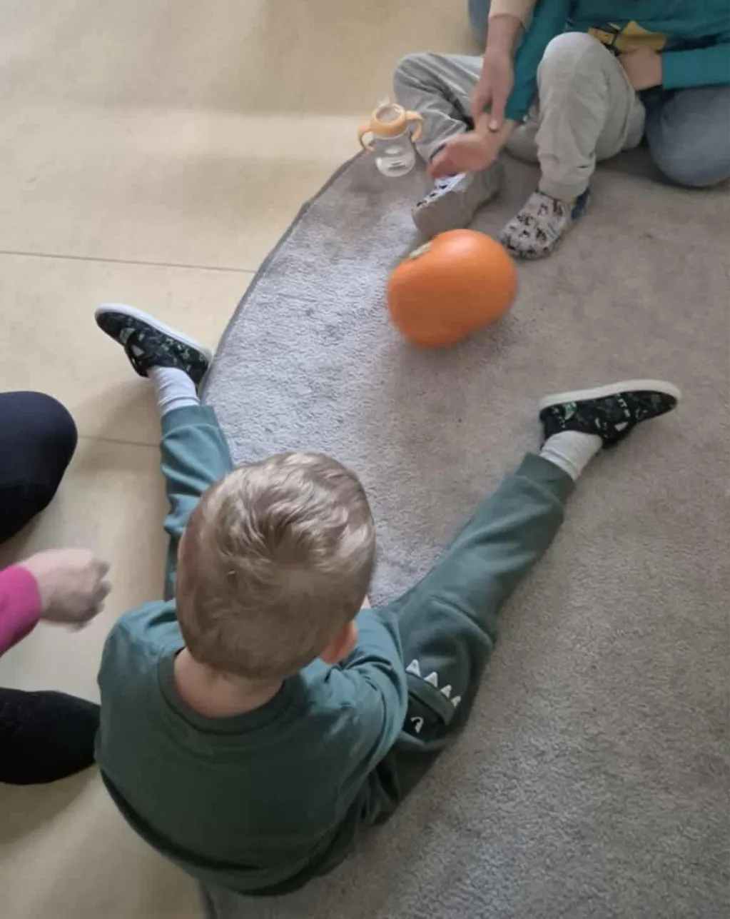 Dużym zainteresowaniem cieszyło się wielozmysłowe badanie dyni – dzieci dotykały, wąchały, smakowały i obserwowały jej wnętrze, poznając strukturę, zapach i smak. Wcześniej miały okazję sprawdzić, jak duża i ciężka może być dynia, co wzbudziło wiele emocji i ciekawości.