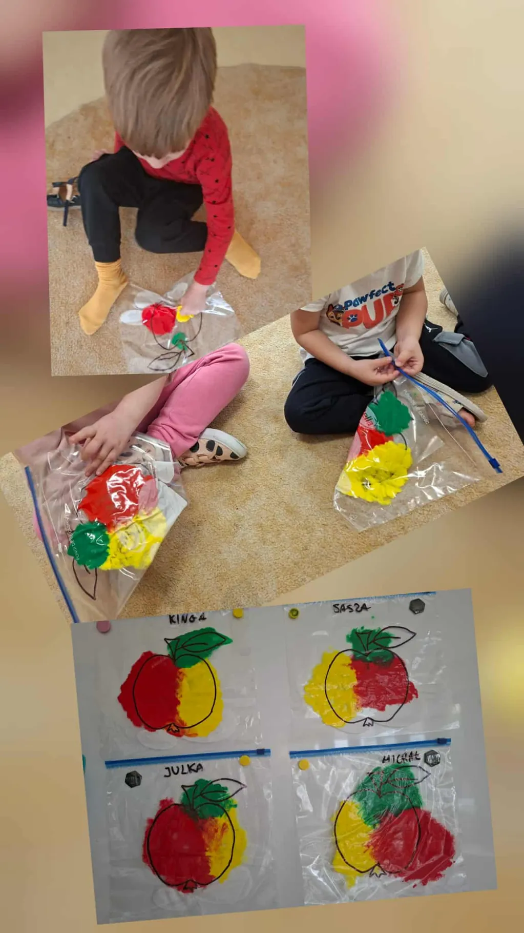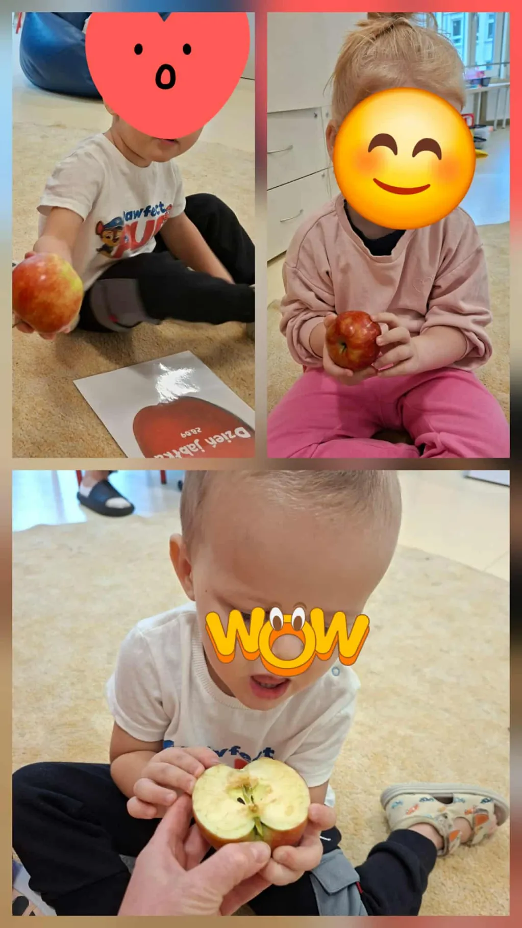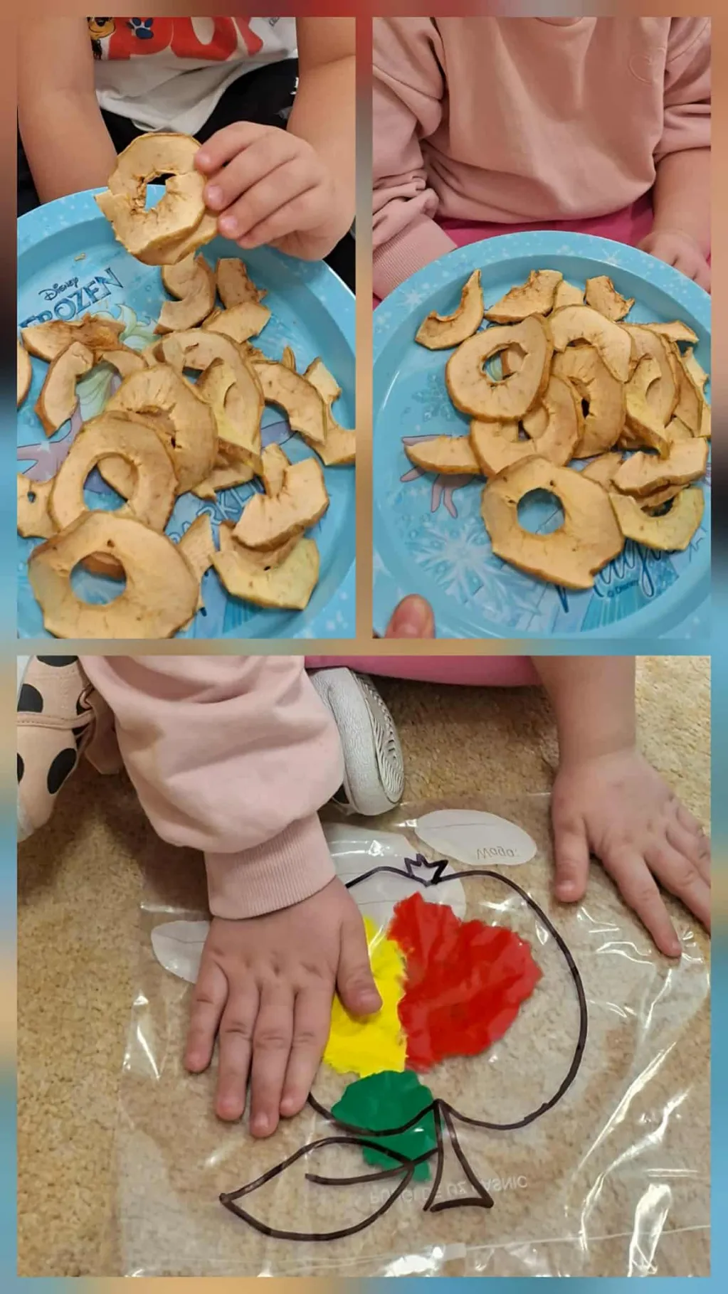 Podczas obchodów Dnia Jabłka przedszkolaki mogły oglądać i dotykać owoc. Mogły zobaczyć co znajduje sie w środku, odszukać pestkę. Mogły spróbować surowych i suszonych owoców. Na zakończenie dzieci pomalowały owoc farbami na folii.