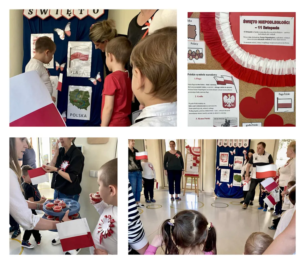 Uroczystość rozpoczęła się wspólnym odśpiewaniem hymnu państwowego "Mazurek Dąbrowskiego". Przedszkolaki ubrane odświętnie, trzymały w dłoniach chorągiewki i kotyliony, które wcześniej wykonały podczas zajęć plastycznych. Następnie dzieci wysłuchały krótkiej opowieści o historii Polski i symbolach narodowych - fladze, godle oraz hymnie. Całość tego wydarzenia dopełniała dekoracja w barwach narodowych, tworząca podniosły i radosny nastrój. Na koniec tych obchodów dzieci z gr. VI wraz z paniami przygotowały małą słodką niespodziankę dla wszystkich zgromadzonych na uroczystości. Obchody zakończyły się wspólnym zdjęciem. Dzięki takim wydarzeniom dzieci uczą się, że miłość do ojczyzny można wyrażać poprzez pamięć, szacunek i wspólne świętowanie.