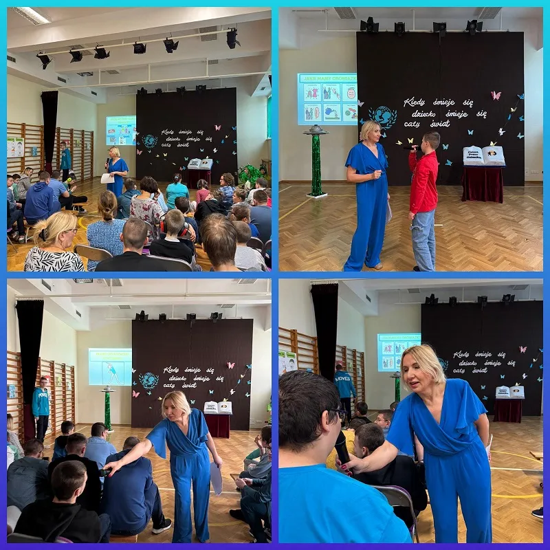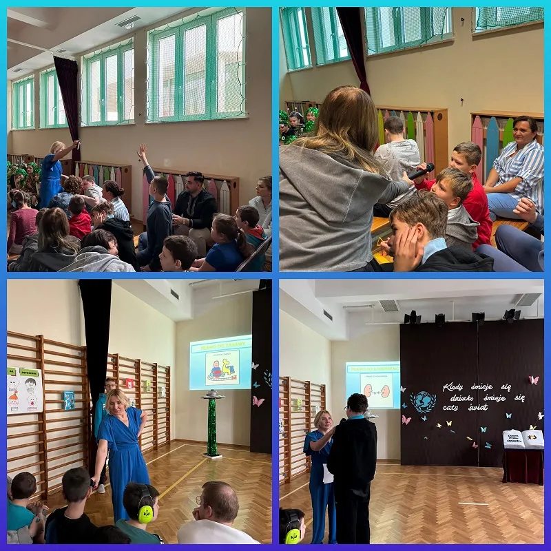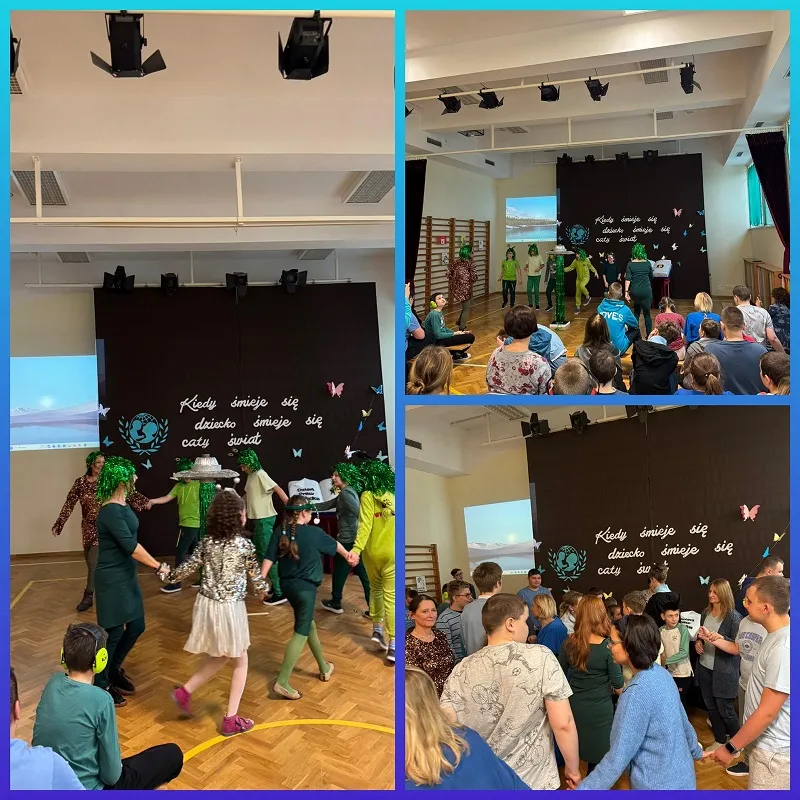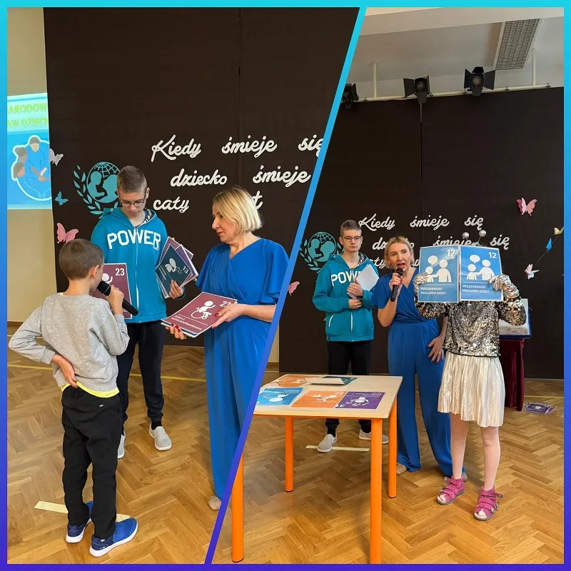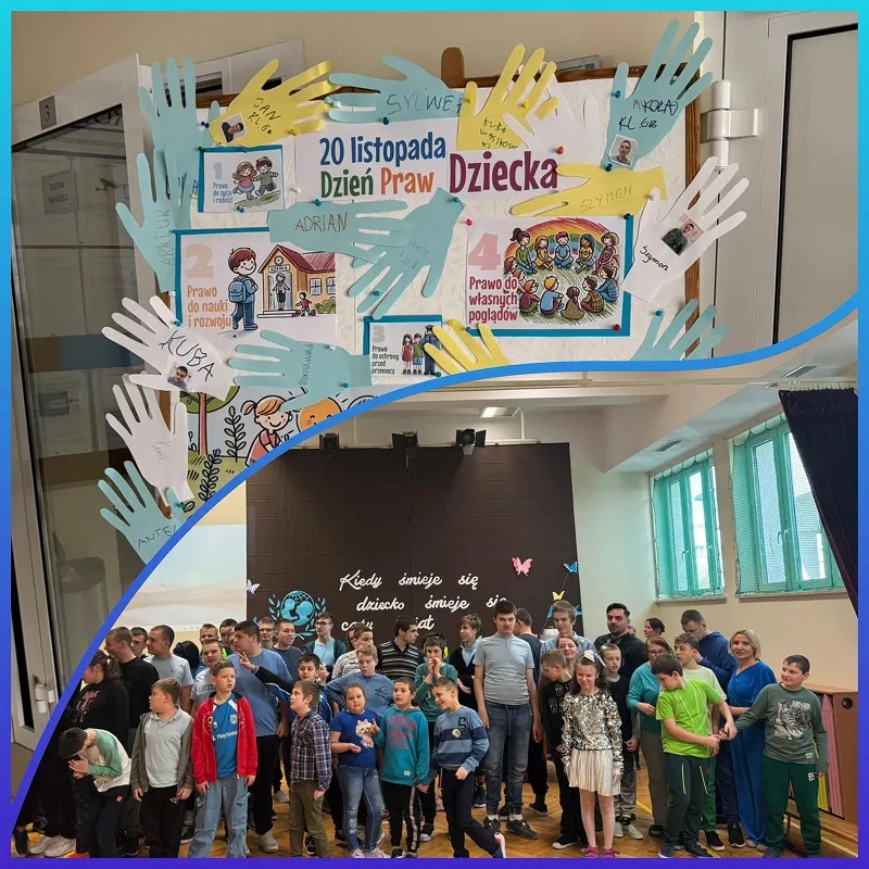 19 listopada 2025 roku o godzinie 10:00 w naszej szkole obchodziliśmy Międzynarodowy Dzień Praw Dziecka. Uroczystość rozpoczęła się od wystąpienia Pani Dyrektor, która serdecznie powitała wszystkich uczestników ww. wydarzenia. Następnie zaprezentowano multimedialną prezentację, dzięki której uczniowie mogli lepiej poznać swoje prawa i obowiązki. Kolejnym punktem programu był radosny występ taneczny pt. „Ufoludki”, przygotowany przez Panią Annę Małyszek‑Zaprzał oraz Panią Karolinę Bućko. Po części artystycznej uczniowie wzięli udział w grze memory, która w ciekawy sposób miała za zadanie utrwalić wiedzę o prawach dziecka. Zwieńczeniem uroczystości była wspólna zabawa, gdzie wszyscy zatańczyli w rytm piosenki pt: „Piosenka o Prawach Dziecka”. Obchody miały swoją kontynuację w klasach. Pod opieką wychowawców uczniowie wykonywali karty pracy, rozwiązywali ćwiczenia online oraz prowadzili rozmowy o tym, dlaczego prawa dziecka są tak ważne. Całe wydarzenie było nie tylko okazją do wspólnej zabawy, ale przede wszystkim do pogłębienia świadomości uczniów na temat ich praw oraz do budowania empatii wobec innych.