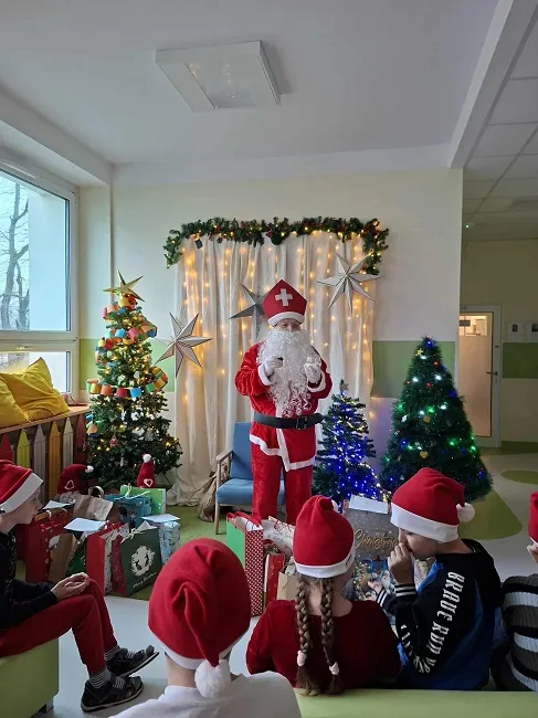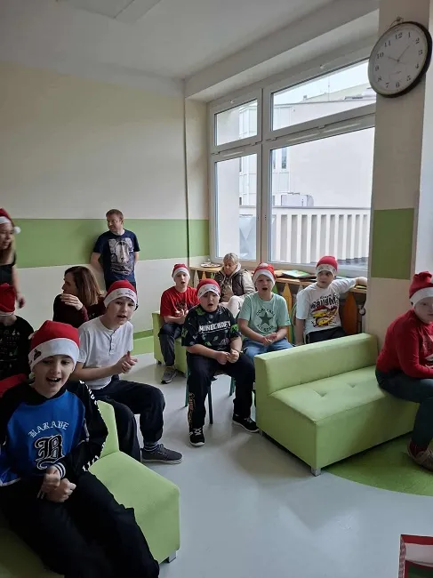 Choć z pozoru to ten sam Mikołaj, którego wszyscy dobrze znamy, tym razem był jakby… bardziej okrąglutki i wyjątkowo rubaszny. Co więcej, zamiast przyjechać saniami, jak na szanującego się Mikołaja przystało, wyszedł z korytarza, na którym mieszczą się: sala klasy 3, gabinet pani pielęgniarki oraz sala do muzykoterapii. Najwyraźniej właśnie tam ćwiczył swoje donośne „Ho, ho, ho!”, bo brzmiało wyjątkowo głośno i radośnie.