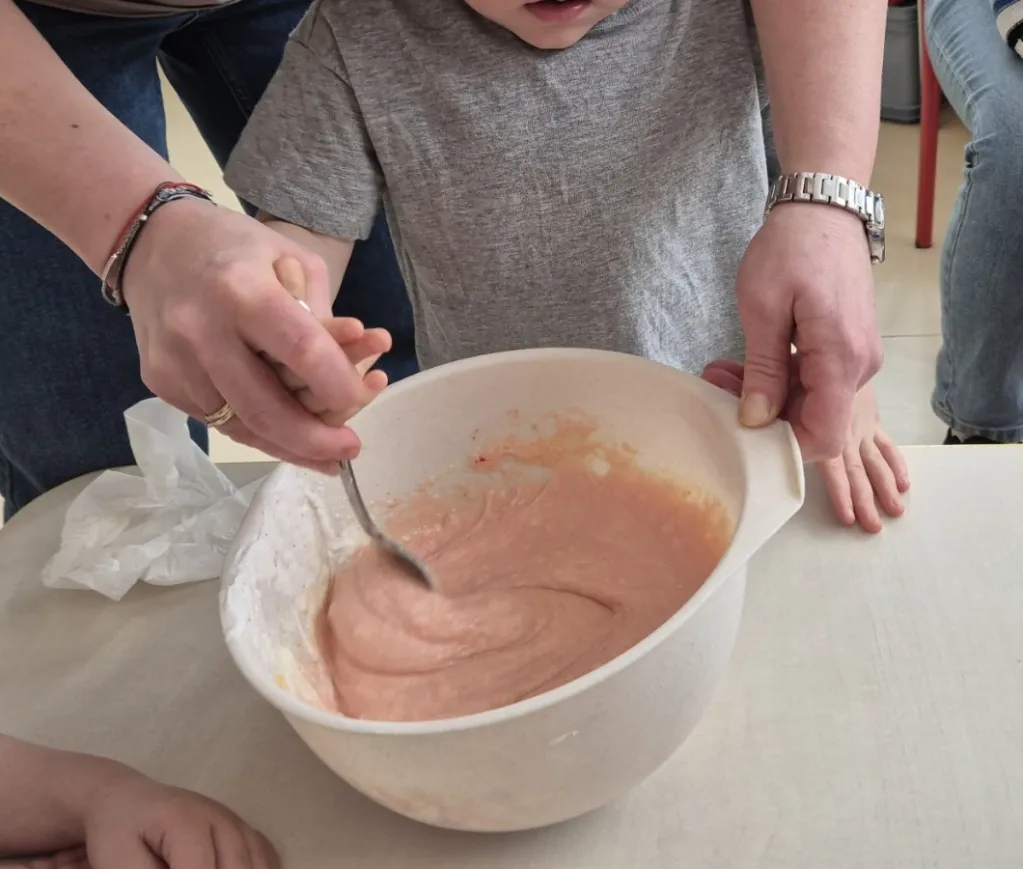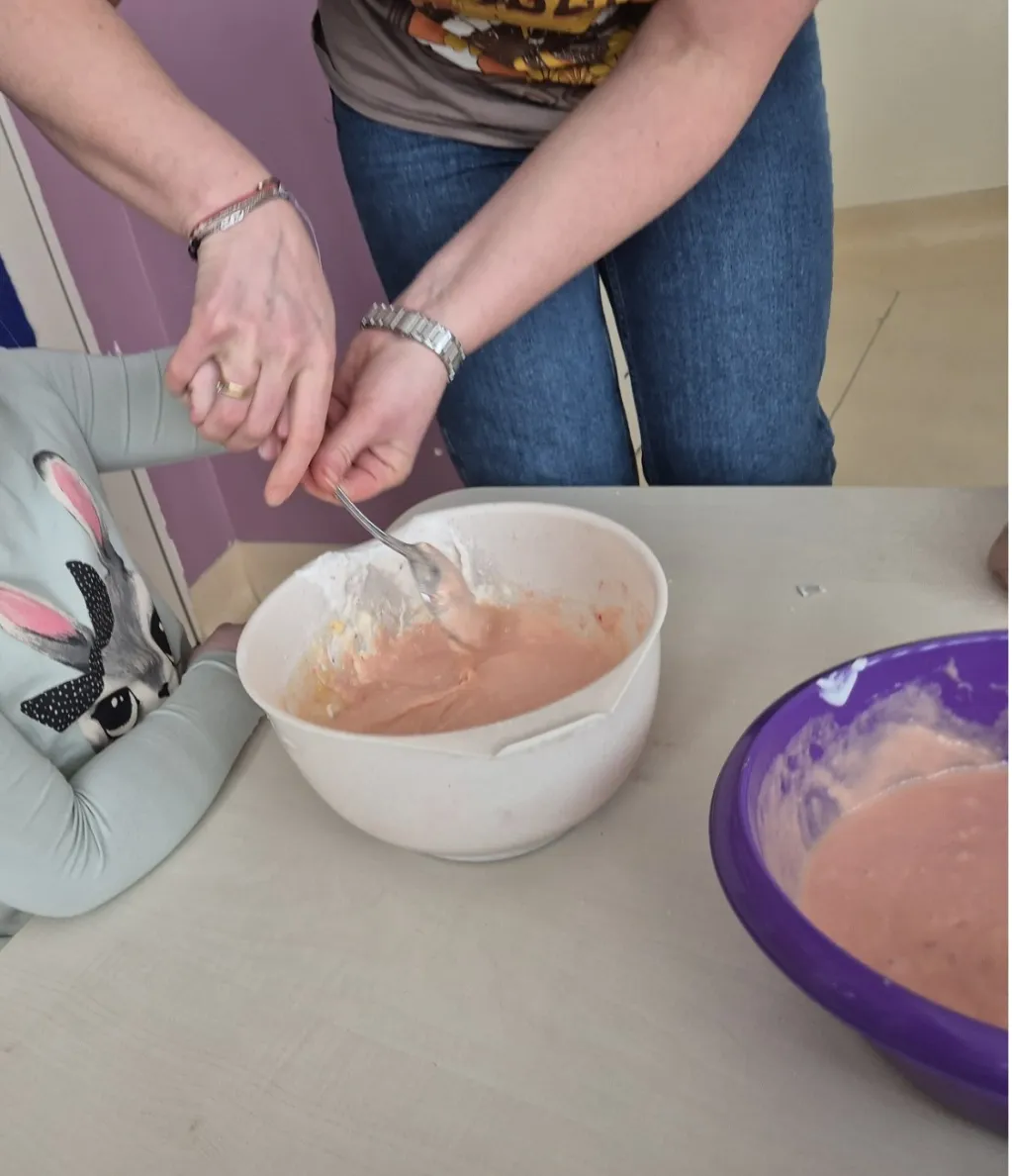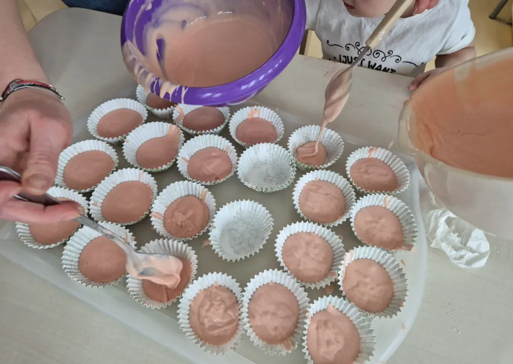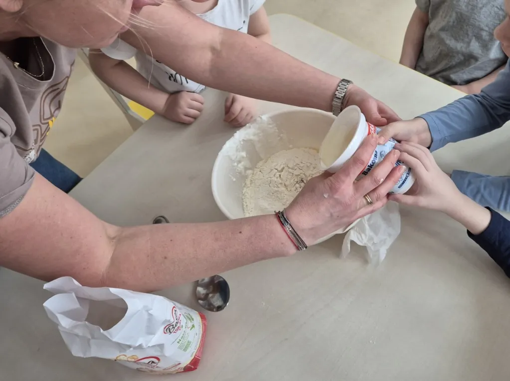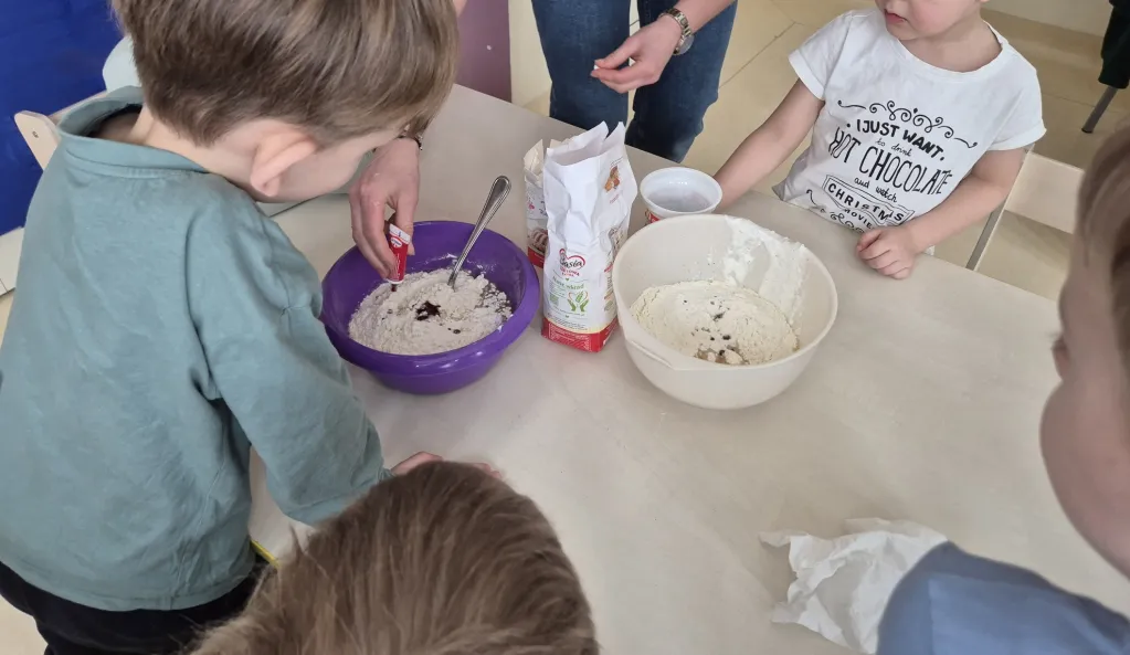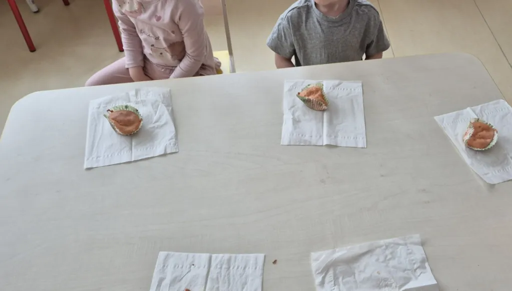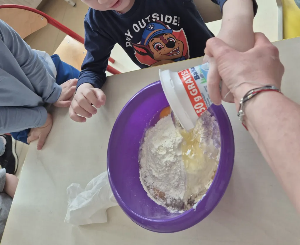 12 lutego 2026 to niewątpliwie jeden z najpyszniejszych dni w roku. Gdy cała Polska z okazji tłustego czwartku ustawia się w długich kolejkach po pączki, grupy I i III połączyły siły i przygotowały fenomenalne babeczki. Jakże przyjemnie było patrzeć jak wszystkie składniki wspólnym wysiłkiem zmieniają się w coraz piękniejszą masę, która następnie wypełniła specjalne foremki. Każdy przedszkolak miał przy stole swoje zadanie i warto było młodych cukierników pochwalić za dobrze wykonaną pracę, bo babeczki wyszły idealne! To się nazywa, pyszna i dobra robota!